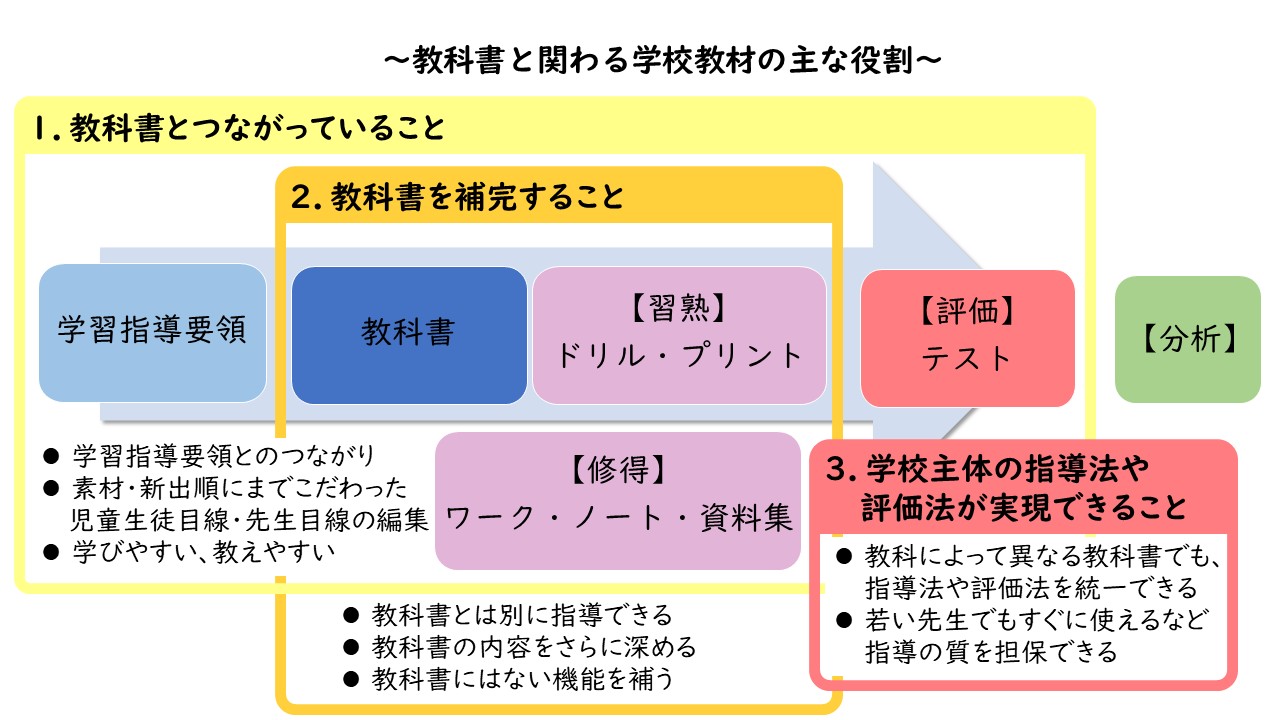 学校用教材は、授業や自習、家庭学習などさまざまな場面で学習効果が上がるように作られています。学習の場面ごとに、役割と機能の異なる教材が使われています。